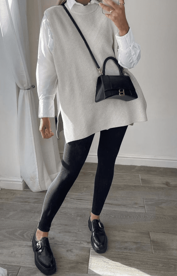 - Лосины в повседневном образе легко сочетаются со свитером оверсайз, футболкой оверсайз, топом, рубашкой или кофтой. Здесь можно перечислять бесконечно, ведь любой образ обеспечит вам уют и комфорт на протяжении дня. Дополнить образ можно кроссовками или ботинками;