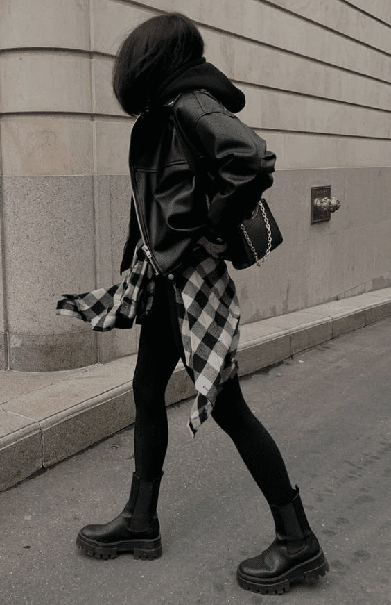- Лосины в многослойном образе идеально сочетаются со свитером оверсайз, длинным кардиганом и даже пуховиком. Образ можно гармонично дополнить сапогами до колена или ботильонами.