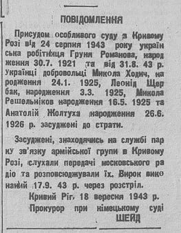 Во время расстрела четверо членов подпольной организации: Решетняка, Желтуху, Ходича, Щербака было убито. Романову тяжело ранили. Когда фашисты отвозили их тела на свалку, чтобы закопать в яму, Романова еще дышала. Ее закопали заживо вместе с ее друзьями.
